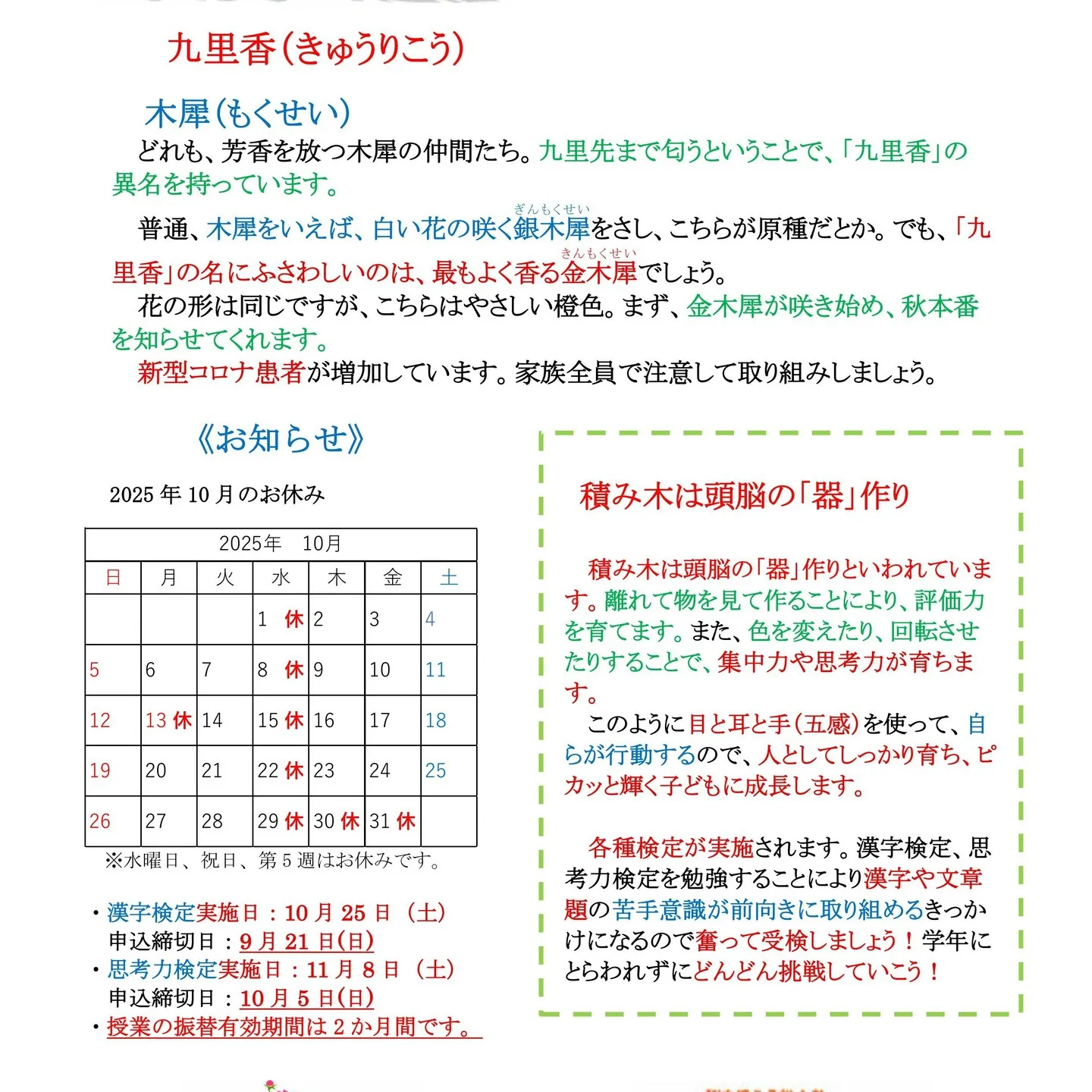 積み木教室の日研教育学院です。 2025/09/11 積み木教室の日研教育学院です。 ひだまり通信が発行されました。 漢字能力検定や思考力検定の締め切りが迫っています。検定に挑戦しよう!! 積み木は頭脳の「器作り」 #脳開発 #高松 #積み木 #英才 #漢字能力検定 #思考力