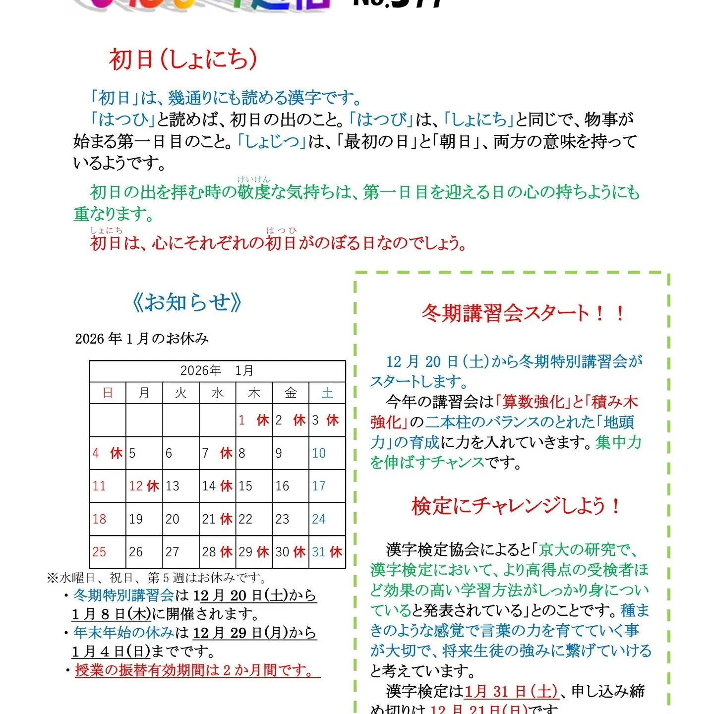 高松市にある積み木教室の日研教育学院です。 2025/12/16 高松市にある積み木教室の日研教育学院です。新しいひだまり通信が発行されました。 12/20(土)より冬期特別講習会が実施されます。いつもと違う授業!ぜひ参加してくださいね!! 12/29(月)~1/4(日)はお休みします。 #高松 #脳開発 #幼児教育 #積み木